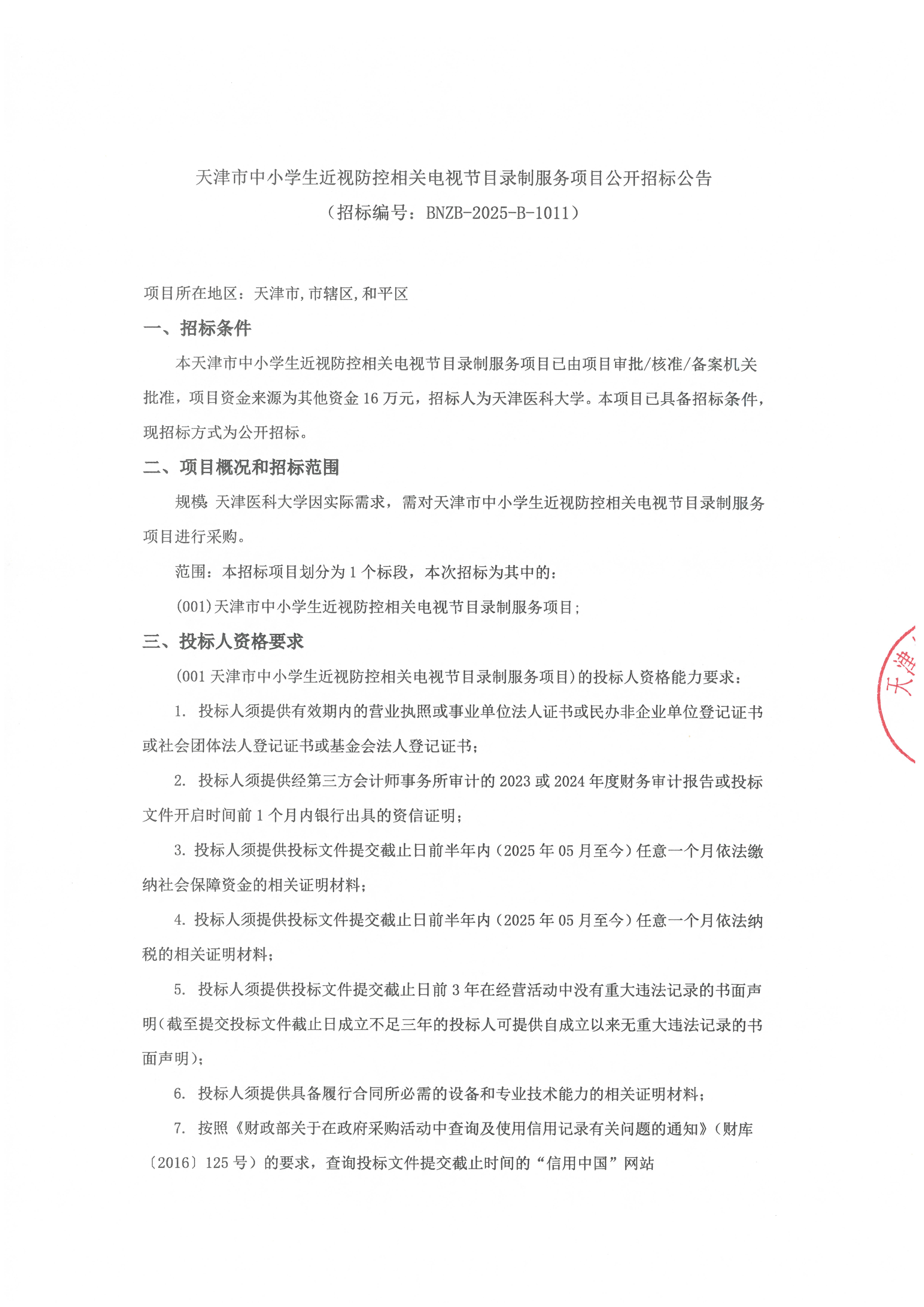 天津市中小学生近视防控相关电视节目录制服务项目